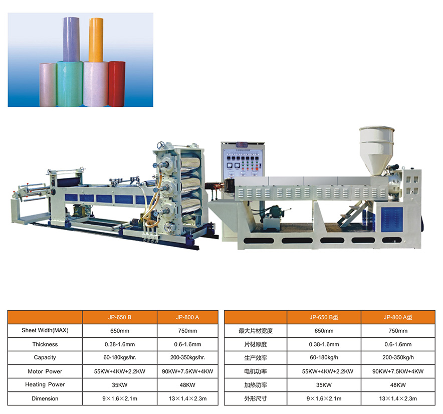 JP系列 挤出片材机组 本机组是将粒状塑料( PP、PS)加热,挤压成熔融状态后,通过压延成形工艺制成片材、供热成型机使用