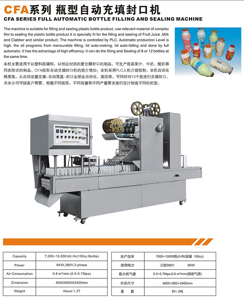 本机主要适用于以塑料瓶填料,以相应材质的复合膜封口的制品,可生产瓶装果汁、牛奶、酸奶等 同类形式的制品。CFA瓶形自动充填封口机的简介增加:本机采用PLC人机介面控制。本机自动化 程度高。从自动定量充填一自动落盖一封口全部全自动化。高效率,可同时对12个瓶进行充填封口。 另本公司可按客户需要,根据不同瓶形,不同容量和不同产量要求进行设计制造不同的机型。