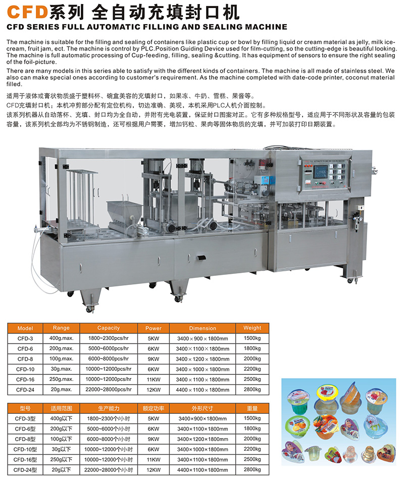 适用于液体或膏状物质盛于塑料杯、碗盒美容的充填封口,如果冻、牛奶、雪糕、果酱等。 CFD充填封口机:本机冲剪部分配有定位机构,切边准确、美观,本机采用PLC人机介面控制。 该系列机器从自动落杯、充填、封口均为全自动,并附有光电装置,保证封口图案对正。它有多种规格型号,适应用于不同形状及容量的包装 容量,该系列机全部均为不锈钢制造,还可根据用户需要,增加钙粒、果肉等固体物质的充填,并可加装打印日期装置。