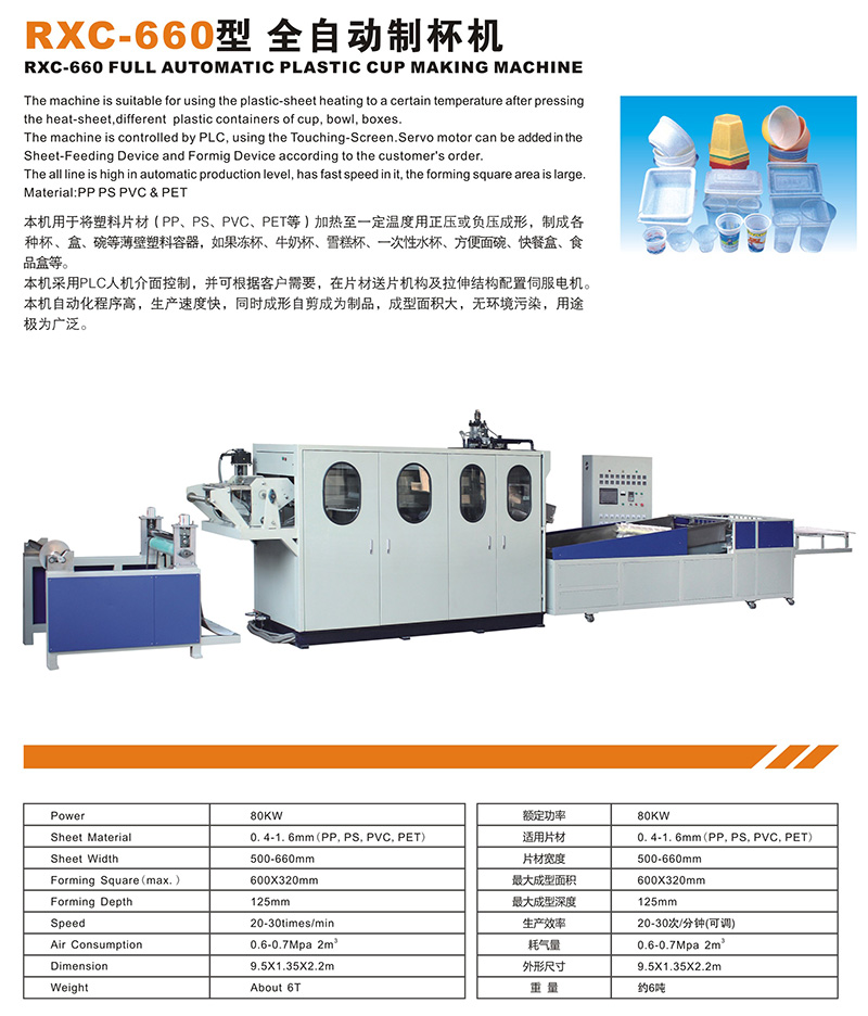 本机用于将塑料片材(PP、Ps、PVC、PET等)加热至一定温度用正压或负压成形,制成各 种杯、盒、碗等薄壁塑料容器,如果冻杯、牛奶杯、雪糕杯、一次性水杯、方便面碗、快餐盒、食 品盒等。 本机采用PLC人机介面控制,并可根据客户需要,在片材送片机构及拉伸结构配置伺服电机。 本机自动化程序高,生产速度快,同时成形自剪成为制品,成型面积大,无环境污染,用途 极为广泛。