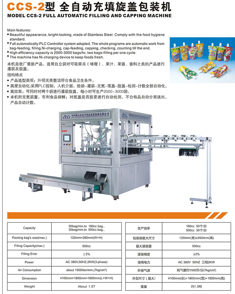 本机是我厂最新产品,适用自立袋对可吸果冻(嗜喱)、果汁、果酱、酱料之类的产品进行 灌装及旋盖。 结构特点 ·产品造型美观;外观光亮整洁符合食品卫生条件。 ·高度自动化;采用PLC控制,人机介面。给袋-灌装-充氮-落盖-旋盖-检测-计数全部自动化。 ·高效率:可同时对两个袋进行灌装旋盖,每小时可生产2000-3000袋。 ·本机附充氮装置,有利食品保鲜;对瓶盖是否旋紧进行自动检测,不合格品自动分离送出, 产品自动计数。